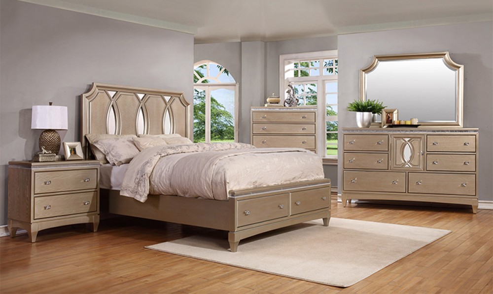 CONTEMPORARY BEDROOM SET WITH FAUX CRYSTAL INSETS, MIRROR INSERTS AND SHAGREN PANELS IN CHAMPAGINE FINISH. PANEL HEADBOARD HAS OVAL DETAILS AND MIRROR INSERTS , STORAGE FOOTBOARD, NIGHT STAND HAS DOUBLE USB WITH NIGHTLIGHT.